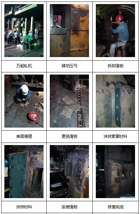 1.****軋機:軋機“牌坊”滑塊位壓虧、修復體積100mm*200mm*0.5-1.5mm(寬*長*深)。軋機“牌坊”壓虧銹蝕位400mm*600mm。